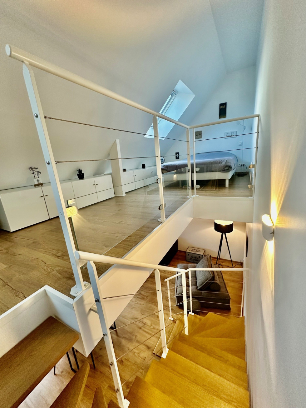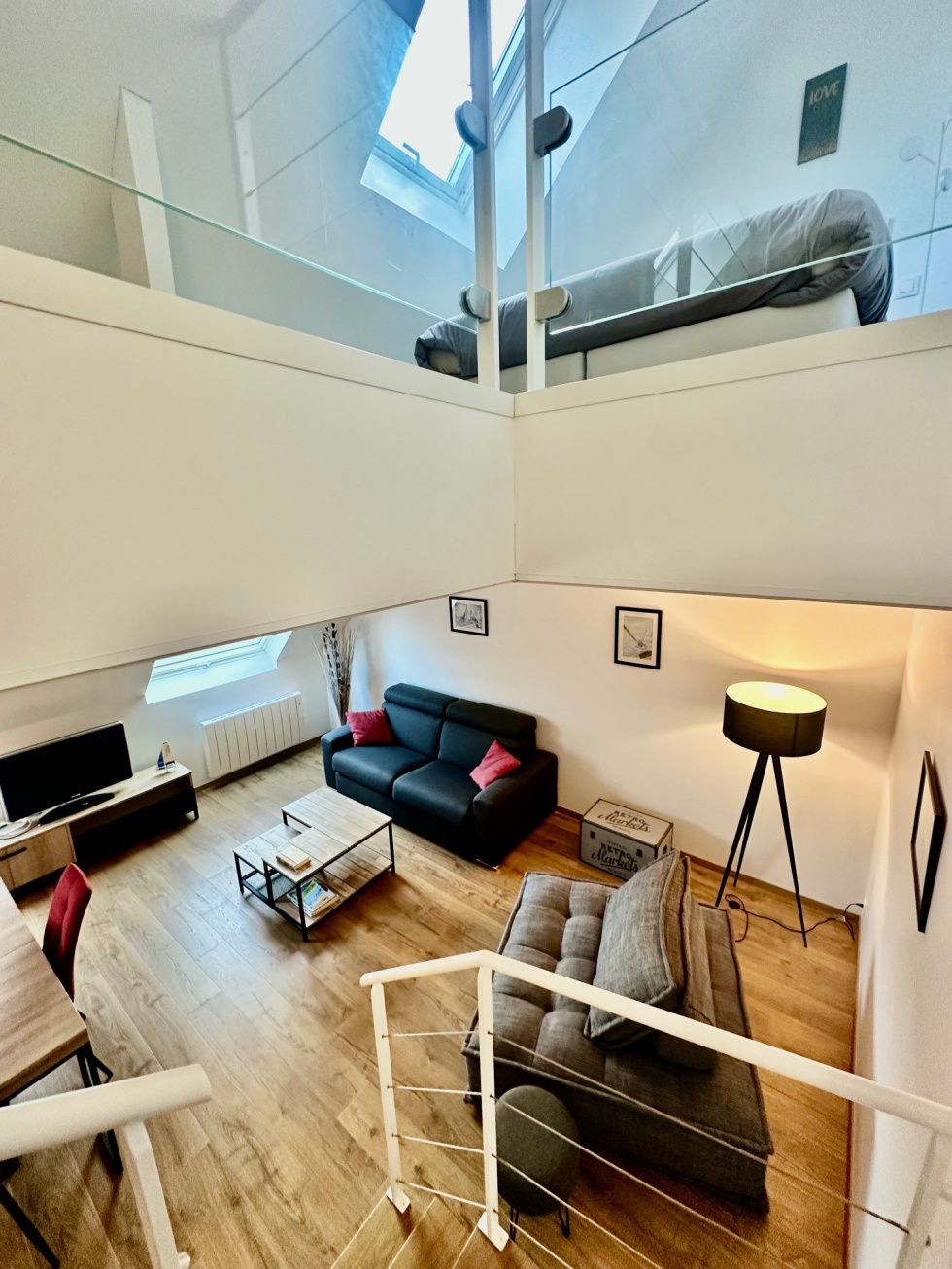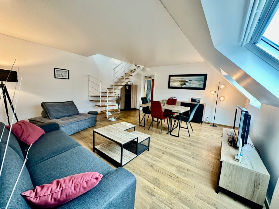 Environnement calme et lumineux pour ce duplex Style"Loft"entiérement rénové situé au 3ème et dernier étage. Sur 45.28m² (loi carrez), 60.61m²(surface utile), vous serez séduits par : Entrée avec placards, spacieuse pièce de vie, cuisine aménagée et équipée, salle d'eau avec wc. A l'étage : Une chambre, salle d'eau avec wc. Un emplacement parking extérieur ainsi qu'une cave complètent ce bien.